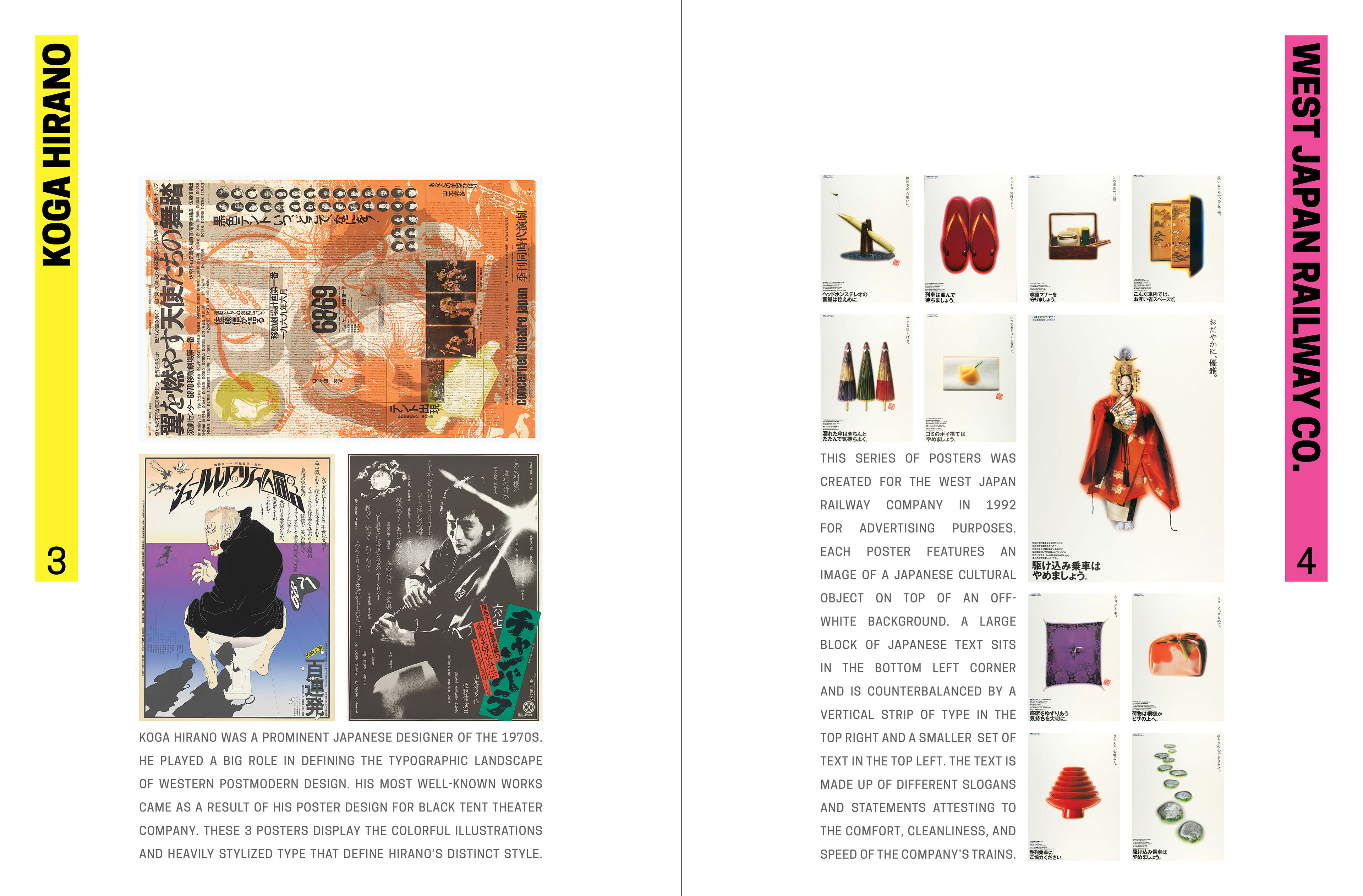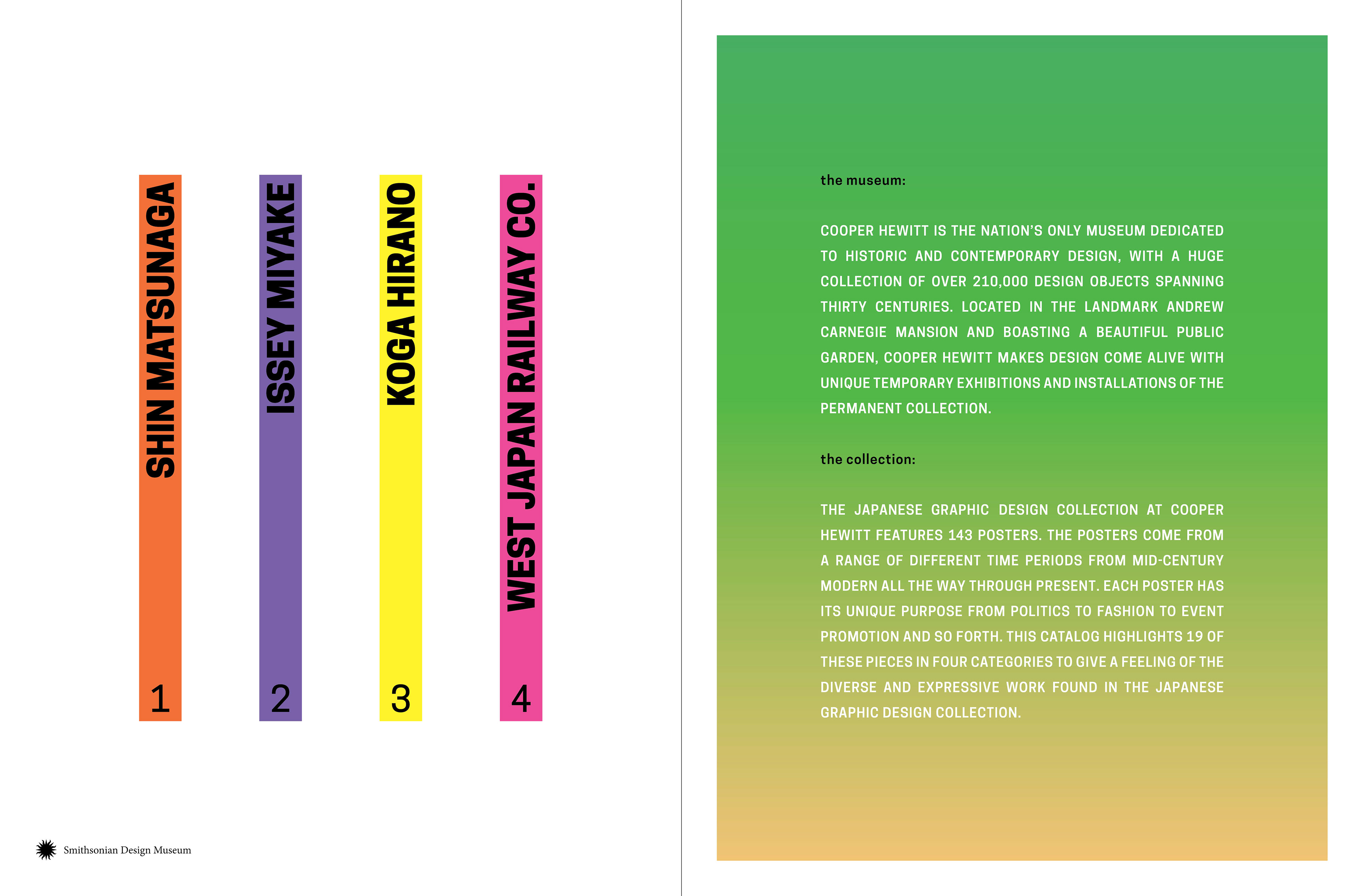 My design process began with research focused on the Cooper Hewitt brand identity system. Using this research as a foundation, I developed a type hierarchy, color palette, and layout system. Secondary research focused on the Japanese Graphic Design Collection. This research informed my choice of works to display in the publication. With these elements, I utilized grids to create the composition for the covers and spreads, dynamically combining the type with the imagery. The result was a print publication that promotes and conveys the spirit of the collection while utilizing the Cooper Hewitt brand identity to create a visually exciting experience for the audience.